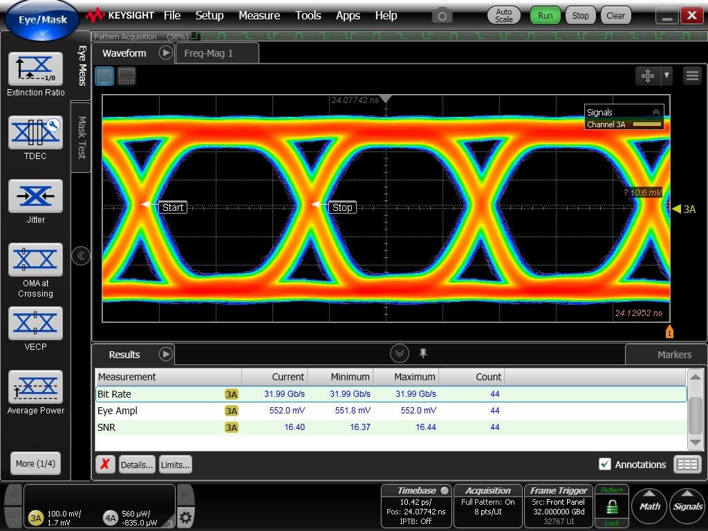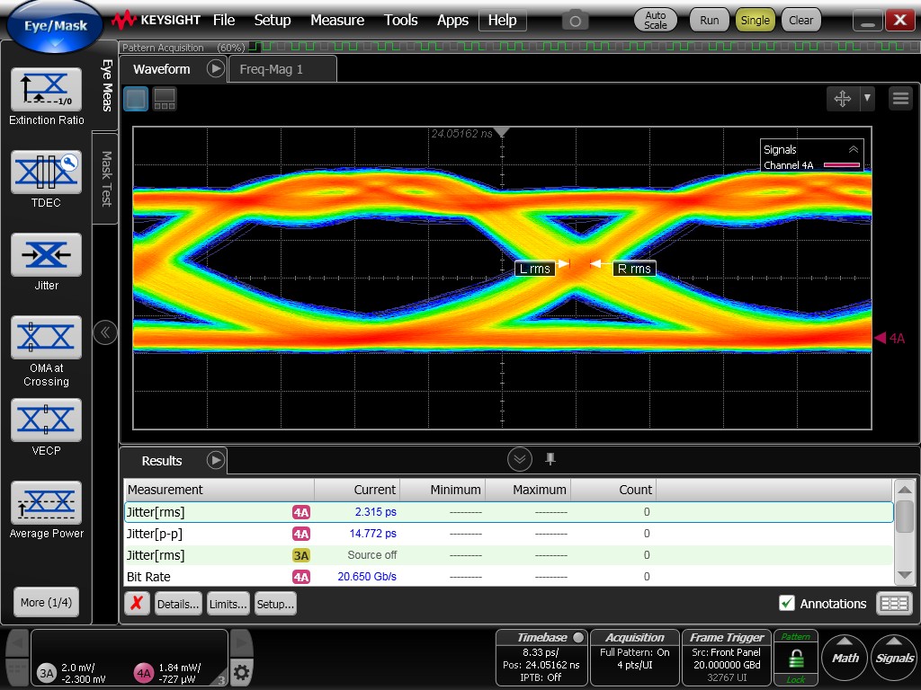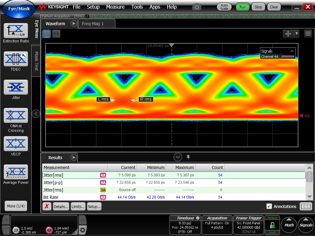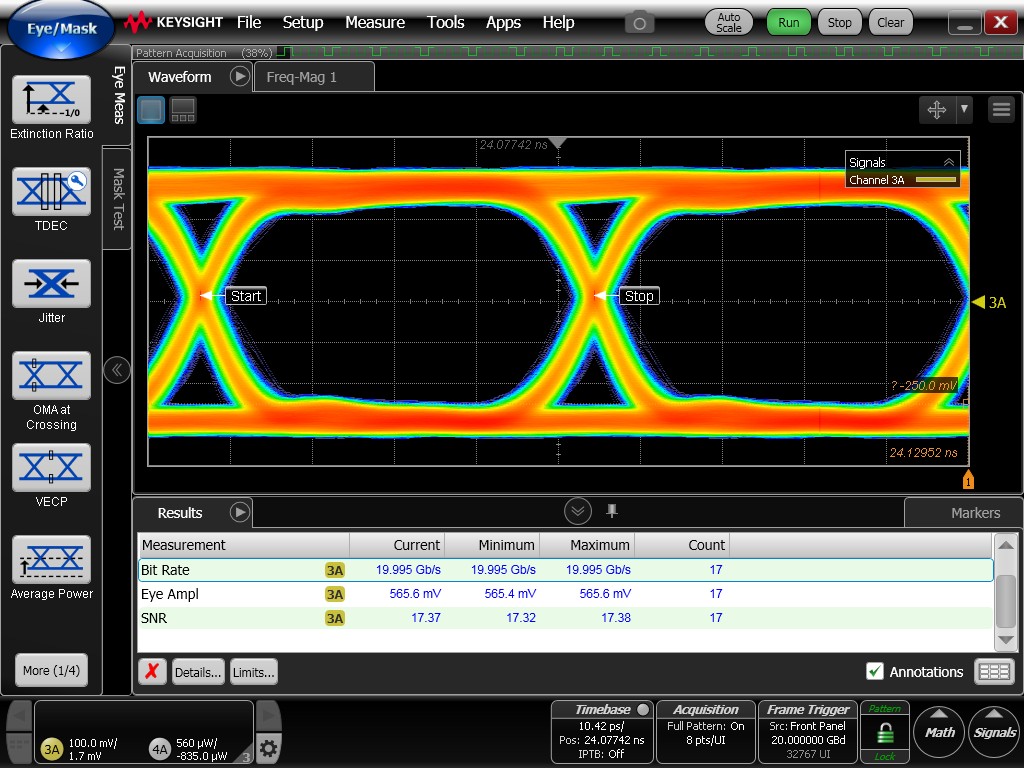 Although the eye diagrams remain reasonably open, they exhibit noticeably degraded quality compared to the previously measured electrical eye diagrams. Increased timing jitter is observed, resulting in thicker eye traces and reduced clarity.