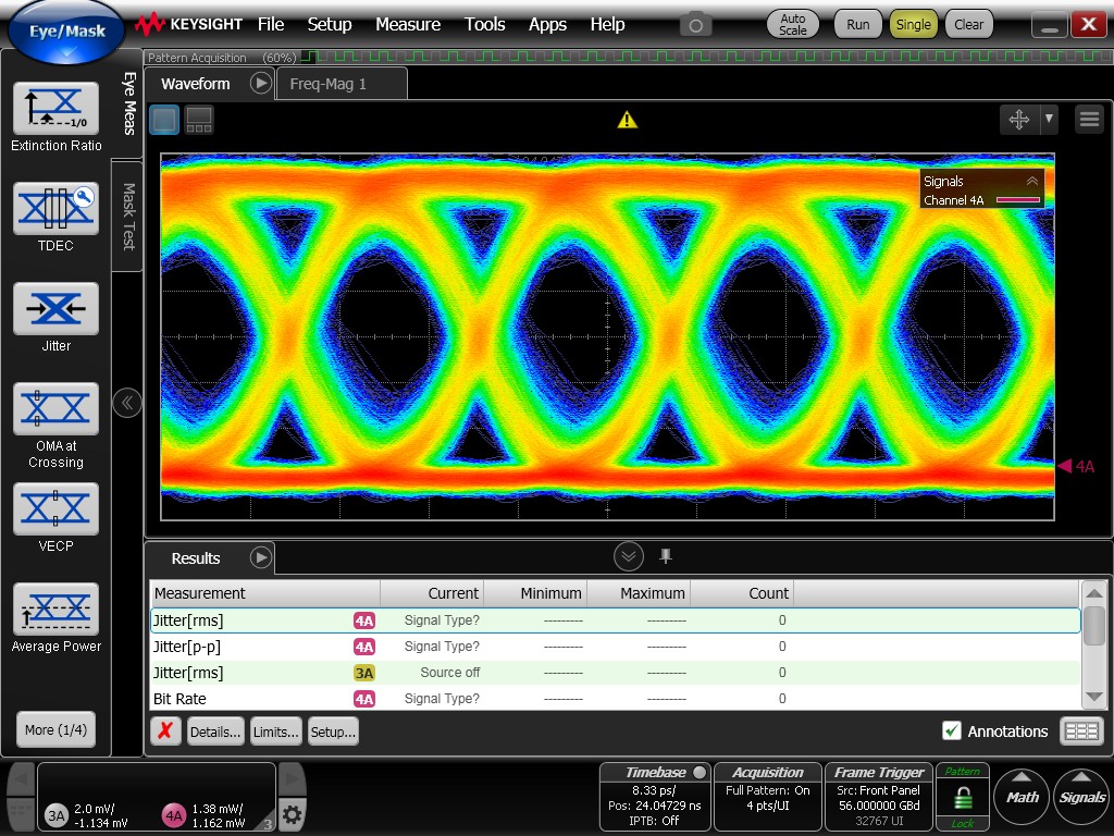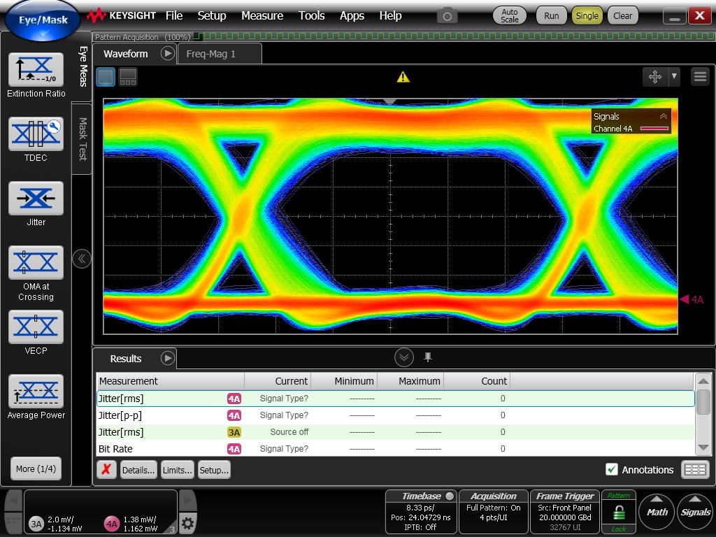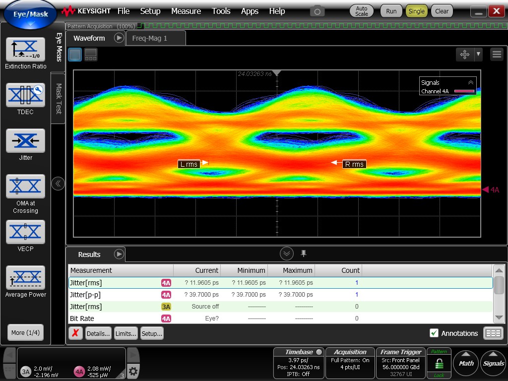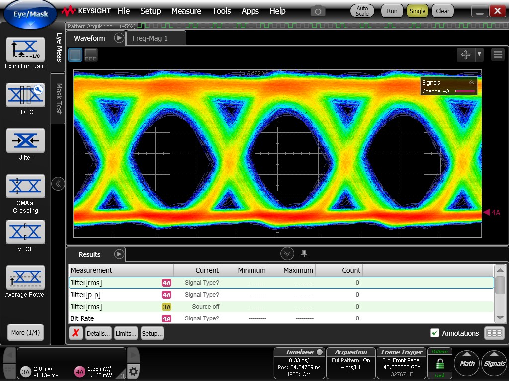Although the eye diagrams remain reasonably open, they exhibit noticeably degraded quality compared to the previously measured electrical eye diagrams. Increased timing jitter is observed, resulting in thicker eye traces and reduced clarity.