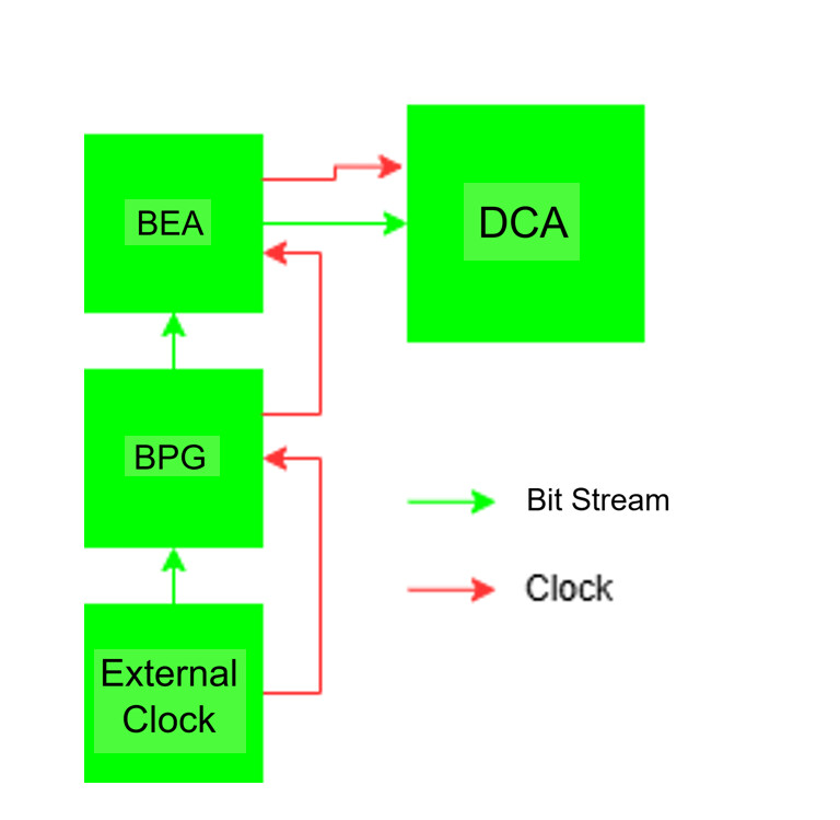 \[P_1 = 2.39\ \text{dBm}\] \[= 10^{2.39/10}\] \[= 1.733\ \text{mW}\] \[P_0 = -9.83\ \text{dBm}\] \[= 10^{-9.83/10}\] \[= 0.104\ \text{mW}\] \[\mathrm{ER(dB)} = 10 \log_{10}\left(\frac{P_1}{P_0}\right)\] \[= 10 \log_{10}\left(\frac{1.733}{0.104}\right)\] \[= 12.22\ \text{dB}\]A Bit Pattern Generator (BPG), synchronized to an external clock, was connected to a Bit Error Analyzer (BEA), which interfaced with a Digital Communication Analyzer (DCA) to capture electrical eye diagrams and evaluate the signal-to-noise ratio (SNR) at data rates up to 70 Gbps.