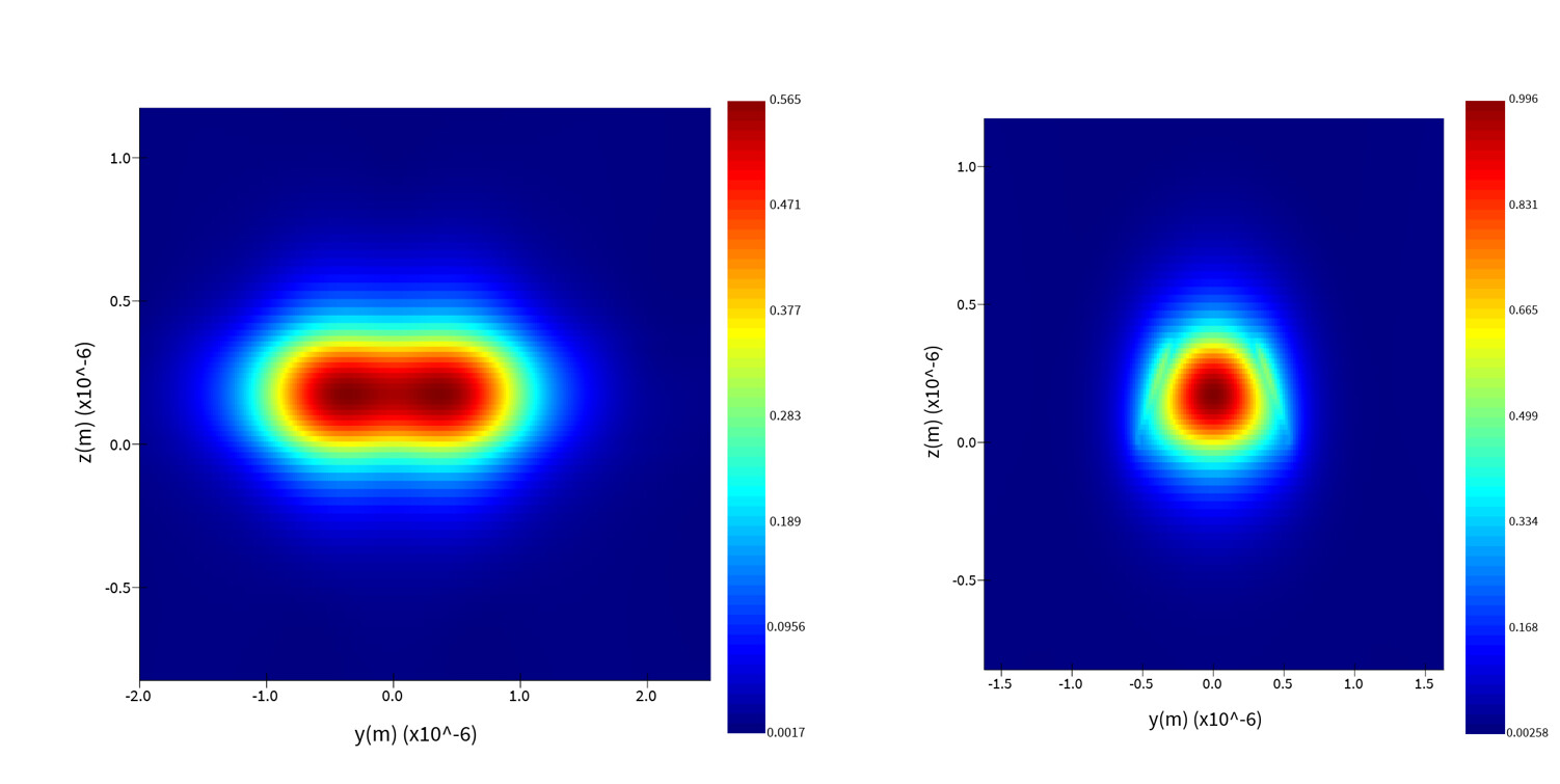 To better understand the optical behavior within the TFLN waveguide crossing, electric field intensity distributions were simulated to visualize how the optical mode propagates and interacts with the device geometry. These heat maps provide insight into mode confinement and how structural features influence optical performance. The left image shows the electric field intensity at the waveguide cross-section, while the right image shows the field distribution at the tapered end of the structure.