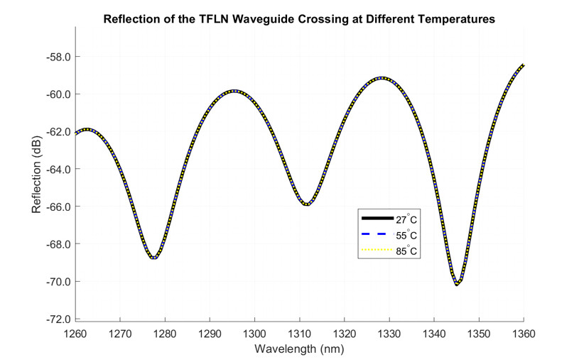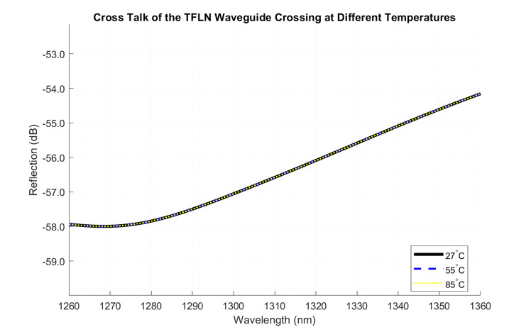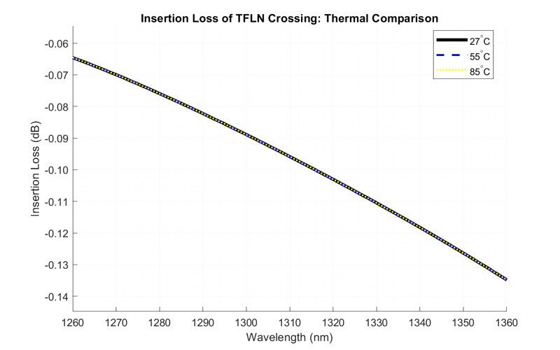 This figure shows the simulated insertion loss (IL) of a TFLN waveguide crossing across the O-band wavelength range under different thermal conditions (27°C, 55°C, and 85°C). Insertion loss represents the optical power reduction between the input and output ports, primarily caused by scattering, reflections, and crosstalk introduced by the crossing geometry.