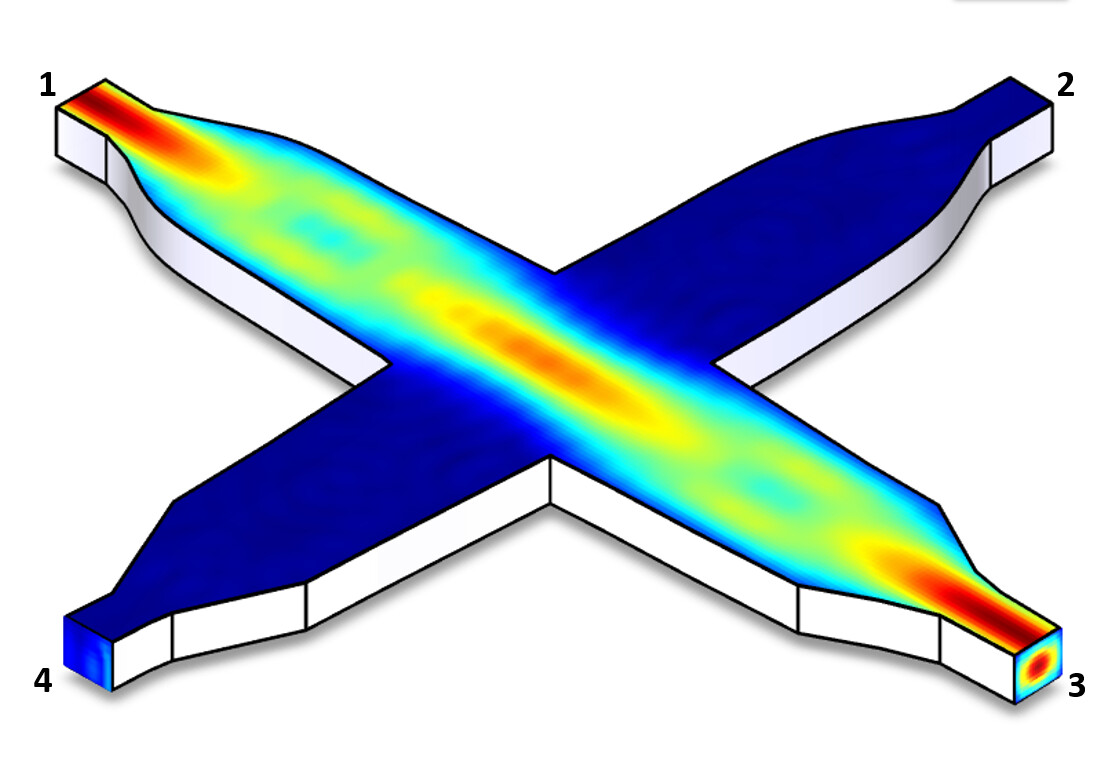 The figure below provides a clear visual representation of a waveguide crossing. Stream A is from port 1 to port 3 and stream B is from port 2 to port 4.