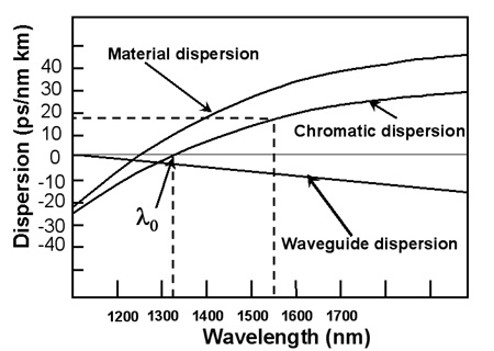 At shorter wavelengths, material dispersion is negative while waveguide dispersion is close to zero. As the wavelength increases, material dispersion increases, whereas waveguide dispersion decreases. In the O-band, these two effects approximately cancel each other, resulting in a chromatic dispersion that is near zero.