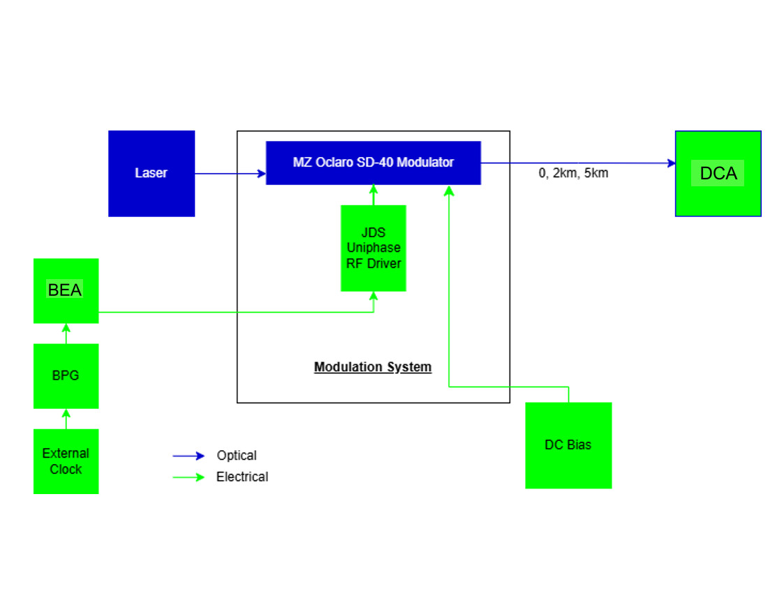 For this experiment, an IM/DD MZM setup was evaluated at three data rates over fiber lengths of 0 km and 5 km.