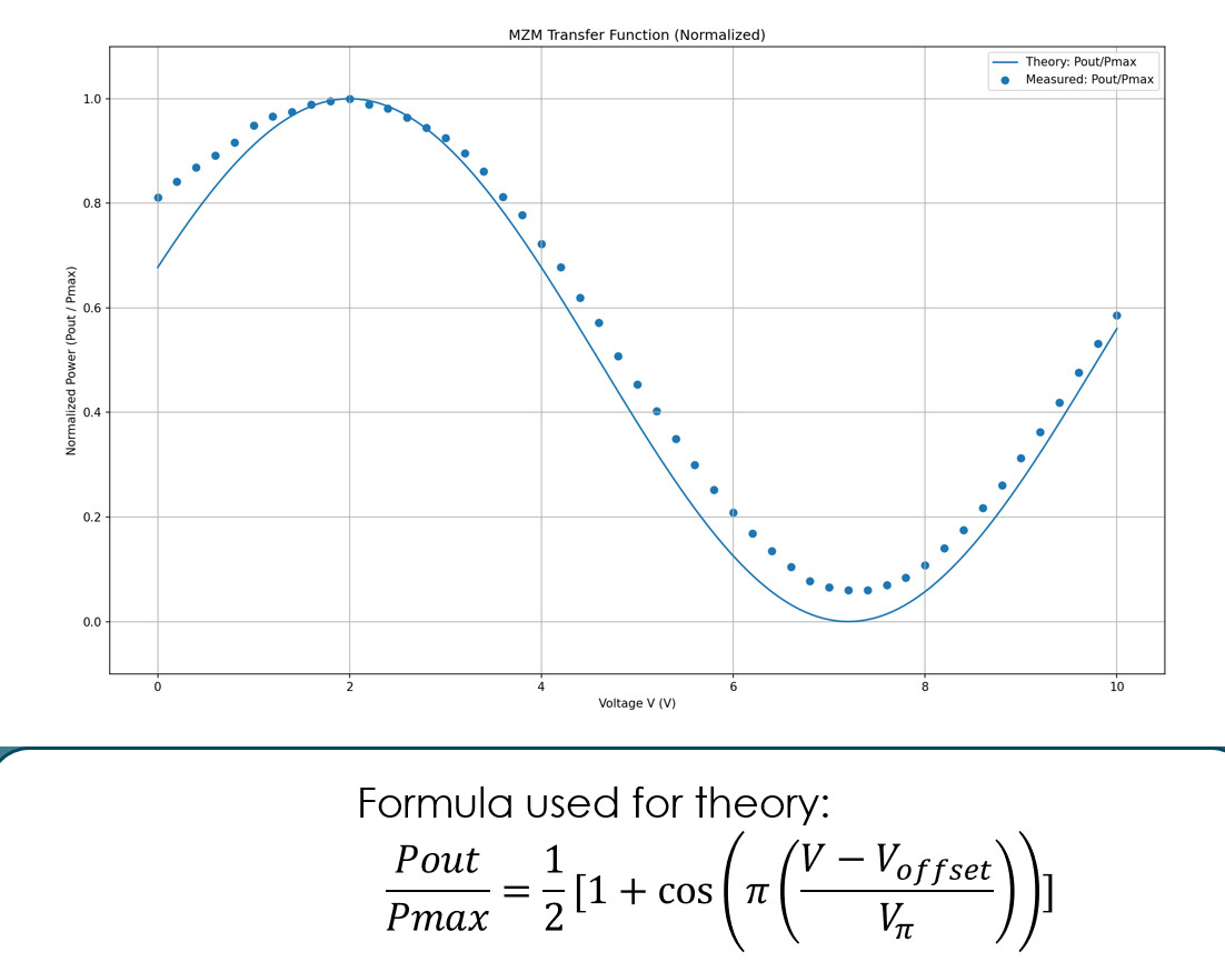 The Mach–Zehnder modulator (MZM) was characterized to establish key device parameters including insertion loss (IL) and half-wave voltage (Vπ). These measurements provided a baseline understanding of modulation efficiency and biasing requirements for high-speed operation.