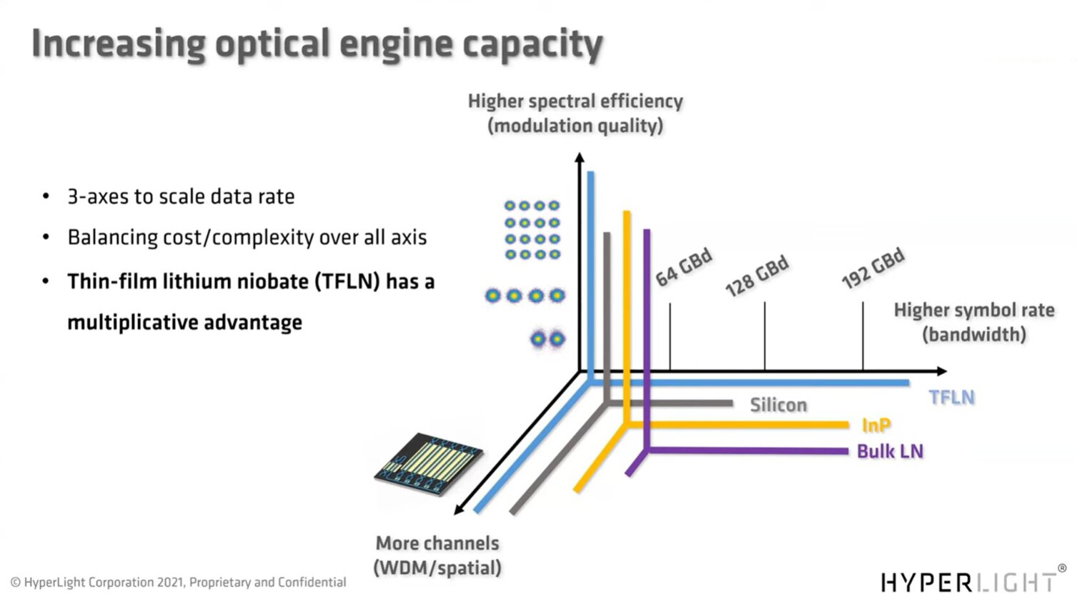 Silicon dominates the electronic field, but why is it not the answer in the photonics world? According to HyperLight Corp, there are three axes to scale data rate: spectral efficiency, number of channels, and symbol rate.